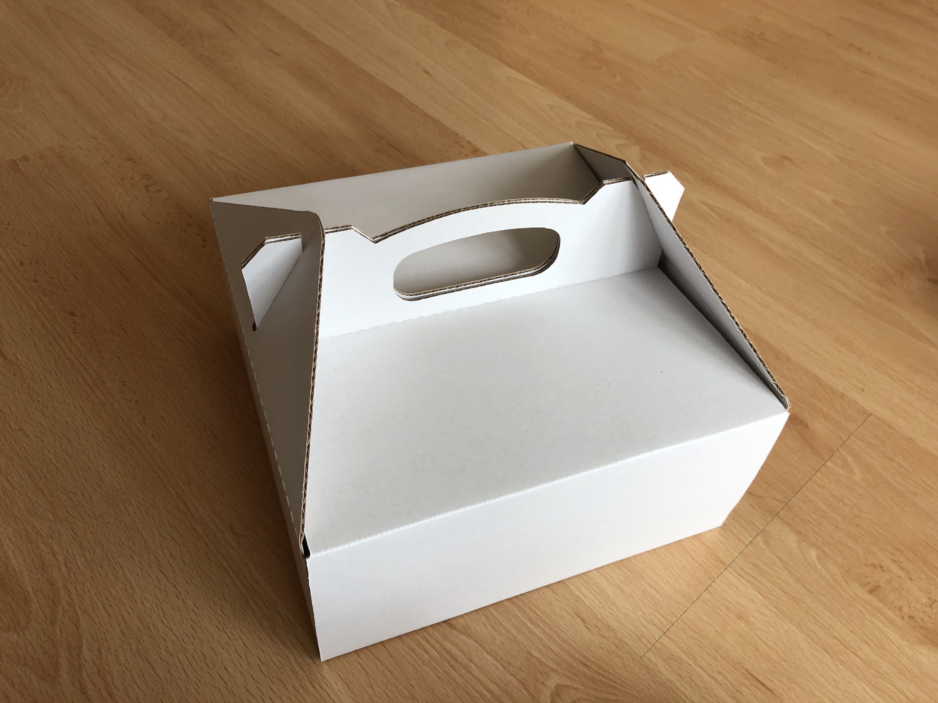 Škatle za prehrano izdelujemo iz valovite lepenke 1.5mm debeline v beli barvi, ki je izdelan za prehrano za katerega imamo tudi certifikat. Vse več je povpraševanja po taki embalaži, saj nadomešča plastično izvedbo škatel in so okolju bolj prijazne.